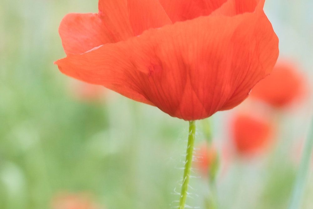 Mohnblume mit roten Blütenblättern. Mohnblumen Feld. Rote Blüten mit grünen Blättern. Frühsommer Blumen.