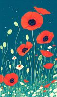Eine farbenfrohe Illustration von Mohnblumen bei Nacht. Schöne kontrastreiche Farben - grün, rot und das dunkle Blau der Nacht.