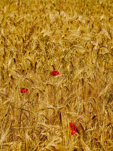 Drei rote Mohnblumen wetteifern mit dem reifen Korn um ihren Platz an der Sonne.