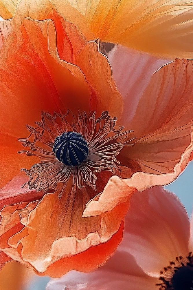 Dieses Kunstwerk zeigt ein intimes Porträt von Mohnblumen in voller Blüte, getaucht in sanftes Licht. Die zarten, fast durchscheinenden Blätter in warmen Orange-, Gelb- und Rosatönen bilden einen schönen Kontrast zum tiefblauen Hintergrund. Die Nahaufnahme zeigt die feinen Details der Blüten, von den zarten Adern in den Blättern bis hin zu den dunklen, fast schwarzen Zentren. Das Spiel von Licht und Schatten betont die weiche Textur der Blütenblätter und lässt sie fast greifbar erscheinen. Die Komposition strahlt eine heitere, verträumte Atmosphäre aus und lädt den Betrachter zum Innehalten und Nachdenken über die vergängliche Schönheit der Natur ein. Dieses Bild ruft ein Gefühl der Ruhe und des Staunens hervor und ermöglicht es uns, die subtilen Nuancen und die vergängliche Pracht dieser einfachen Wildblumen neu zu schätzen.