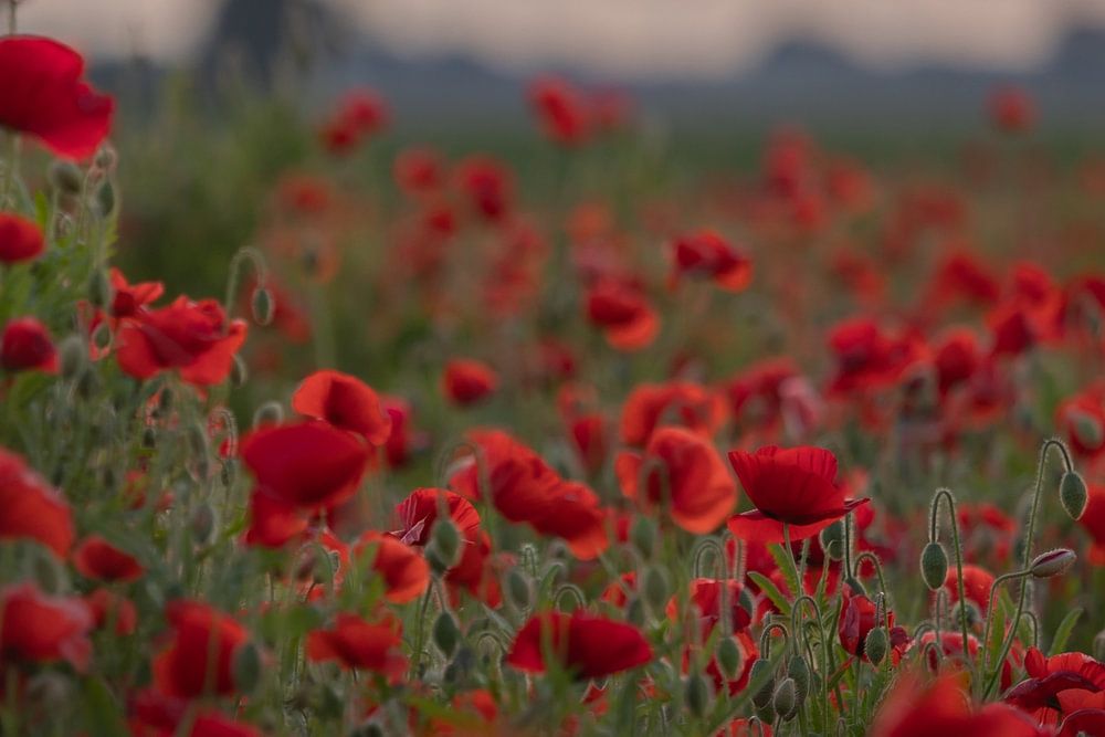 Das letzte sanfte Sonnenlicht streift über die Mohnfelder.