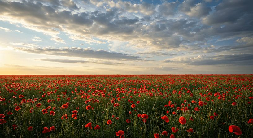 Dieses Kunstwerk entführt Sie in eine endlose Mohnlandschaft unter einem sanft bewölkten Himmel. In leuchtendem Rot wogen tausende Mohnblüten auf grünen Stängeln und wiegen sich im warmen Licht der aufgehenden oder untergehenden Sonne. Die Weite des Feldes bis zum Horizont vermittelt ein Gefühl von Freiheit und unberührter Natur.