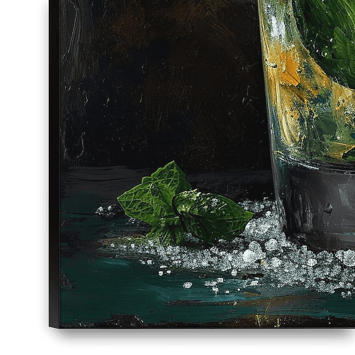 Mojito | Mojito Artwork - Dieses robuste und doch raffinierte Stillleben zeigt ein Glas mit einem erfrischenden Getränk, vermutlich einem Mojito, angesichts der Minzblätter und Eiswürfel, die einen geschmackvollen Kontrast zum dunklen Hintergrund bilden. Die lockeren Pinselstriche und die reiche Textur verleihen dem Kunstwerk ein…