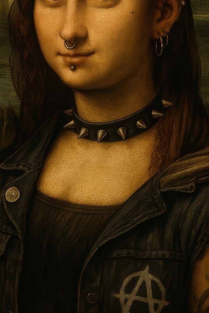 Ein kraftvolles Statement mit einer überraschenden Wende: Eine ikonische Figur im punkigen Gewand, die mit leuchtend pinkem Haar und einem scharfen Blick die Grenzen von Tradition und Modernität sprengt. Diese faszinierende Mischung aus Alt und Neu verleiht jedem Raum, besonders dem Wohnzimmer, einen Hauch rebellischer Kreativität.