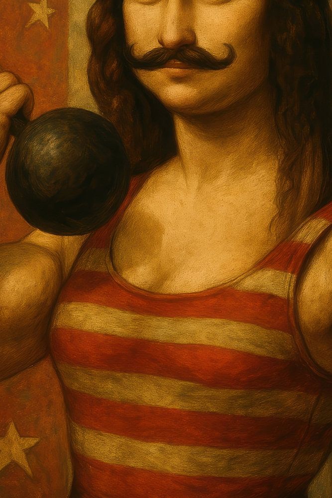 Mit kraftvollem Auftreten präsentiert sich ein muskulöser Akrobat in einem stylischen, gestreiften Anzug, der mit Schwung eine Hantel stemmt. Sein markanter Schnurrbart und der nostalgische Zirkus-Hintergrund versprühen einen Hauch von Vintage-Charme. Dieses Kunstwerk bringt lebendige Energie und einen Hauch von Abenteuer in jedes Wohnzimmer, das nach einem besonderen Akzent verlangt.