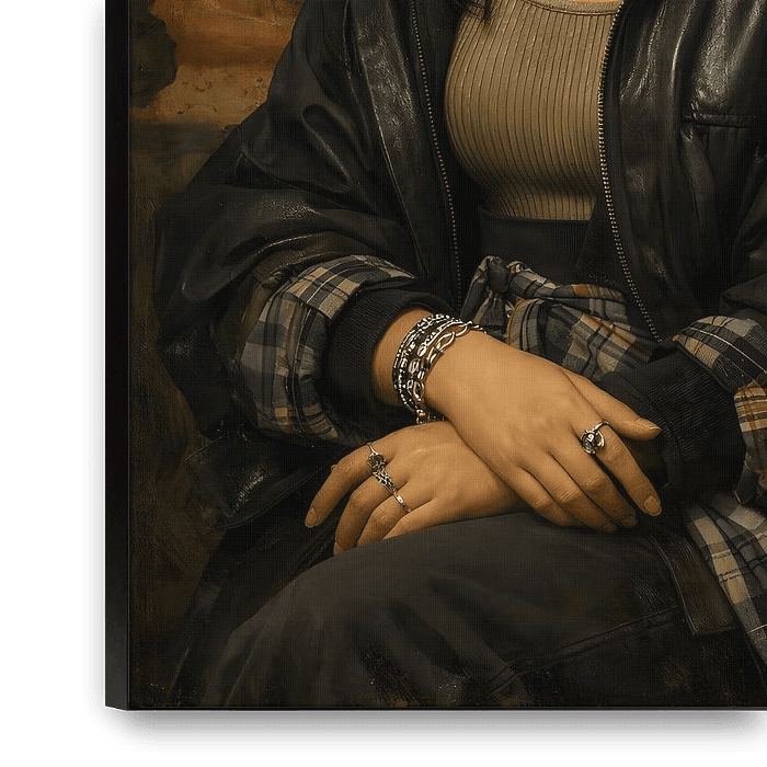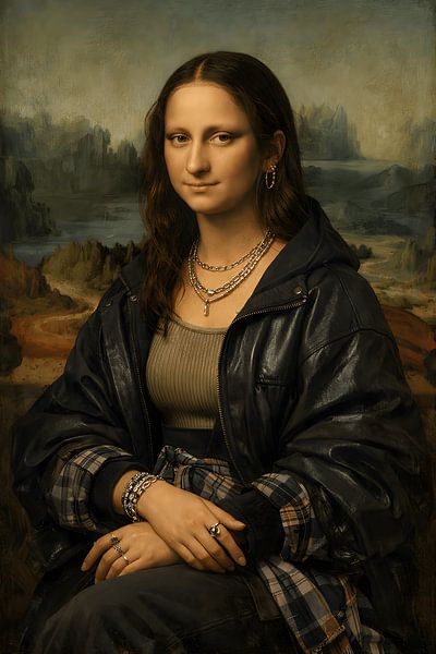 Leonardo da Vincis Mona Lisa, wie du sie noch nie gesehen hast. In dieser zeitgenössischen Neuinterpretation trägt die berühmteste Frau der Kunstgeschichte eine schwarze Lederjacke, mehrreihige Silberketten und auffällige Ringe. Ihr rätselhaftes Lächeln bleibt unverändert, doch ihr Erscheinungsbild hat sich von einer Renaissance-Dame zu…