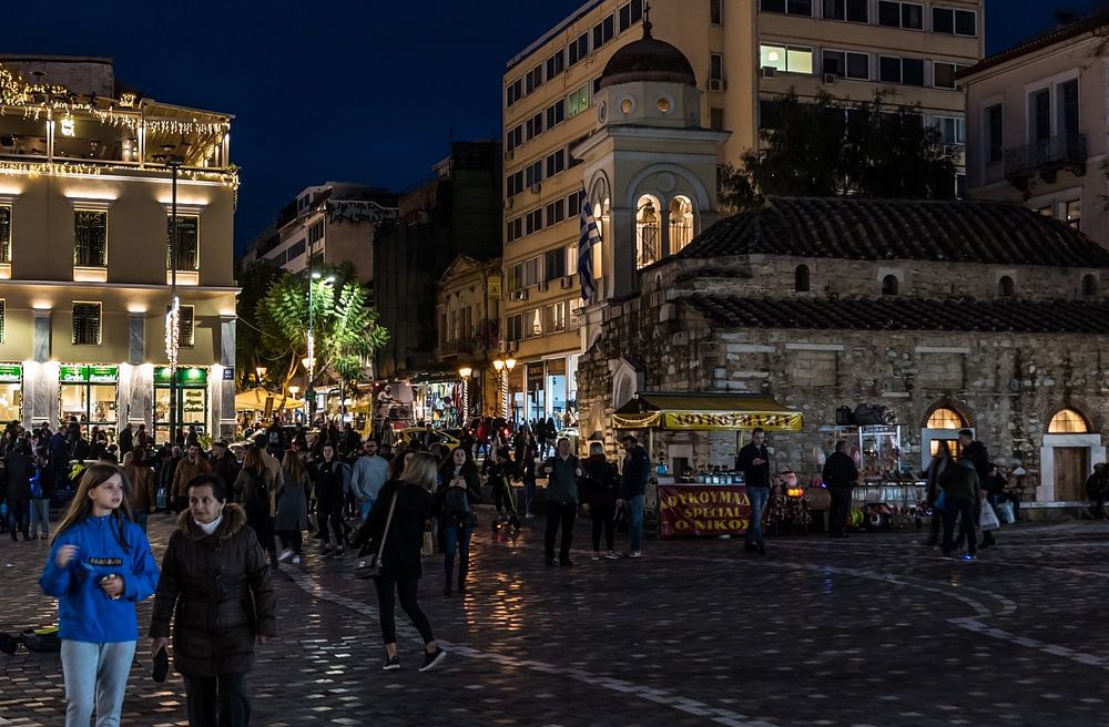 Athener Altstadt, Attika - Griechenland - 12 28 2019 Einheimische und Touristen spazieren über den Monastiraki-Platz bei Nacht