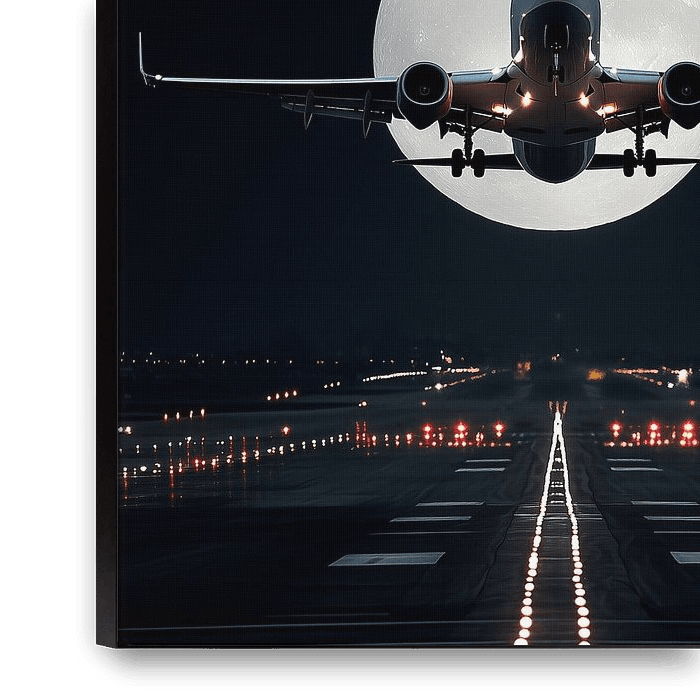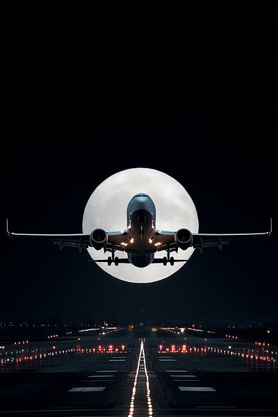 Eine perfekt getimte Aufnahme eines startenden Flugzeugs, direkt vor einem riesigen, leuchtenden Vollmond. Die Landebahnbeleuchtung lenkt den Blick auf die himmlische Konstellation und fängt die stille Schönheit des Nachtflugs ein.