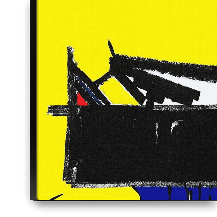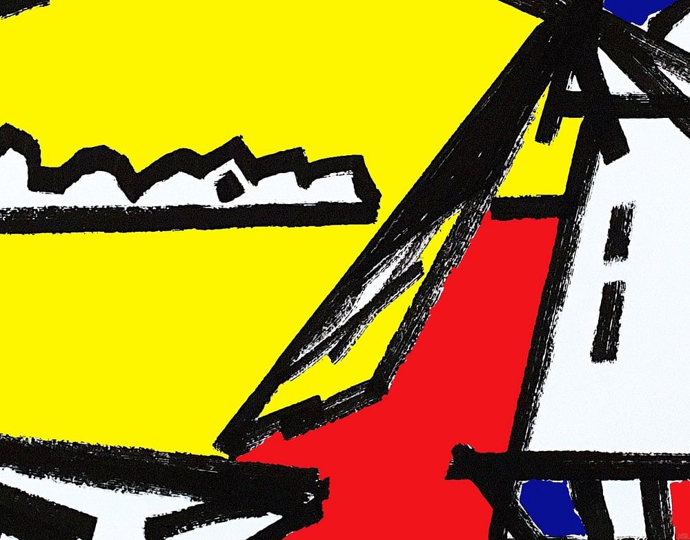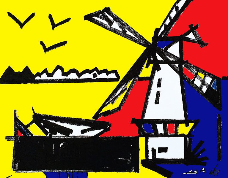 Bestelle dieses Landschafts-Wandbild Mondrian Mühle PoP von Mister Artsy als Reproduktion auf Leinwand, Alu-Dibond, als Poster, Fototapete oder Acrylglasbild.