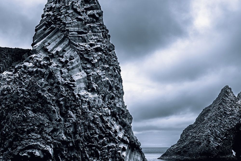 Dieses Bild, das an der zerklüfteten Küste von Kópasker Strönd im Nordosten Islands aufgenommen wurde, zeigt die reine Essenz der Landschaft. Die Farben wurden auf eine fast monochrome Palette reduziert, wodurch die Struktur und Textur der Basaltformationen voll zur Geltung kommen. Die riesigen, geometrischen Säulen verschwinden langsam im grauen Meer, das nahtlos in den düsteren Himmel übergeht.