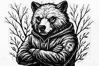Ein robuster Bär mit Kapuzenpulli ist frontal mit verschränkten Armen abgebildet, umrahmt von kahlen Ästen und kraftvollen Schwarz-Weiß-Linien. Die scharfen Konturen und tiefen Schatten erzeugen einen grafischen Kontrast, der sofort die Aufmerksamkeit auf sich zieht. Das klare Linienspiel und die symmetrische Komposition strahlen Ruhe…