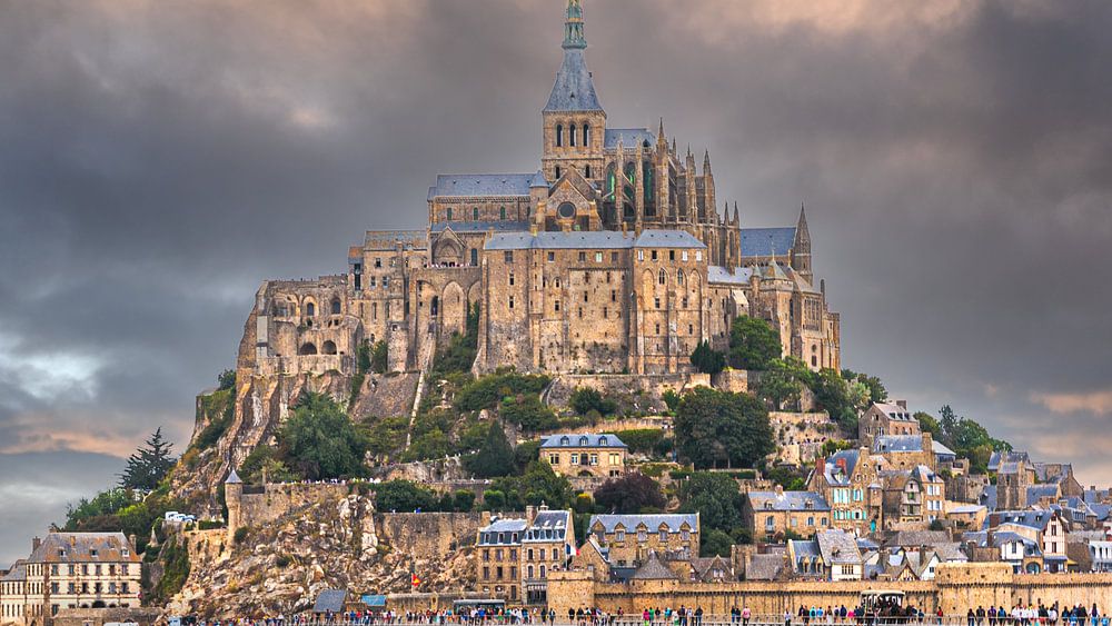 Mont Saint-Michel ist eine kleine, felsige Gezeiteninsel[1] in der Normandie, Frankreich, die in einer großen Bucht[2] an der Mündung des Couesnon liegt. Das Granitmassiv des Mont Saint-Michel wird von einer mittelalterlichen Abtei gekrönt. Seit 1898 befindet sich auf dem Turm der Abteikirche eine Statue des Heiligen Michael, die sich einhundertsiebzig Meter über die Bucht erhebt.
