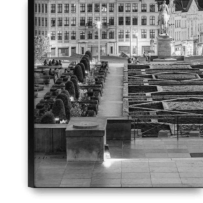 Schwarzweißfotografie Blick vom Mont des Arts auf den Park und das Rathaus in der Unterstadt in Brüssel bei Nacht, Belgien