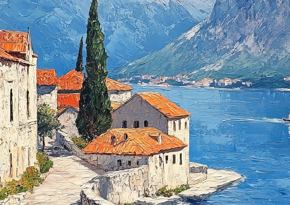 Montenegro Landscape | Serene Heights - Dieses Landschaftsgemälde zeigt eine typisch montenegrinische Ansicht mit einer Kirche, bunten Dächern und einem majestätischen Berg mit Blick auf das ruhige Meer. Es ist in leuchtenden Farben und dicken Pinselstrichen gemalt, die die Textur und das Licht Montenegros hervorheben.