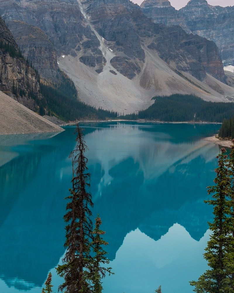 Der ikonische blaue See mit den Bergen im Hintergrund, schönen Spiegelungen und schroffen Felsen. Moränensee. Es bleibt ein perfektes Bild für die Wand!