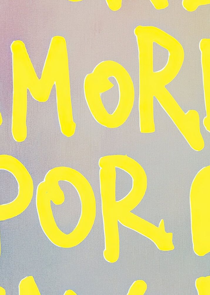 Ein gelber Text „More Amore Por Favor“ auf einem pastellfarbenen Hintergrund, in einem minimalistischen Stil. Im Hintergrund sind Pinselstriche mit bunten, weichen Farben zu sehen, die eine fröhliche Stimmung und helles Licht vermitteln.