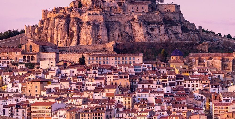 Morella ist eine kleine Stadt in der autonomen Region Valencia in Spanien. Sie gehört zur Provinz Castellon. Es ist eine strategisch günstig gelegene Stadt mit einer Stadtmauer in der historischen Region Maestrazgo. Schon von weitem sieht man die Stadt auf einem Hügel mit einer alten Festung an der Spitze. Hier sehen wir Morella bei einem wunderschönen Sonnenuntergang.