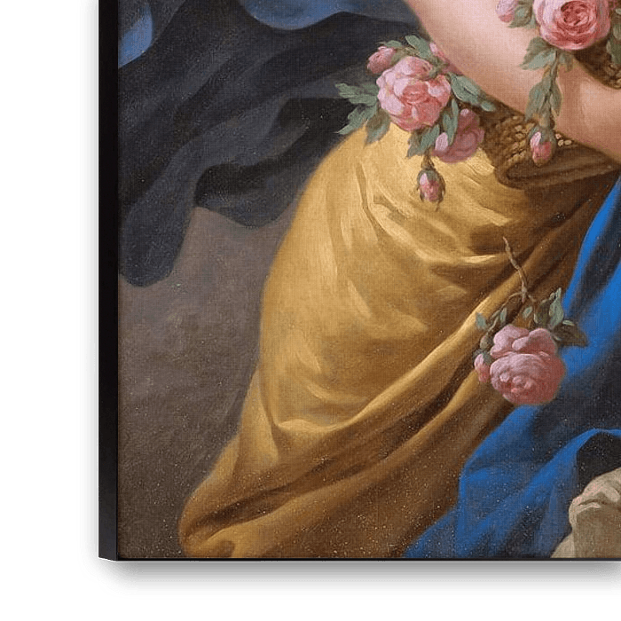 Die Frau auf der linken Seite hat eine Titte entblößt, und auch das Mädchen auf der rechten Seite hat die Hälfte ihres Busens nackt. Die Frauen in griechisch-römischer Kleidung sind mit Blumen und den Zügeln des vorderen Pferdes beschäftigt.