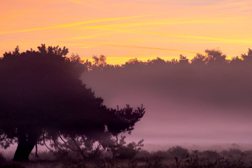 Bei Sonnenaufgang im Naturschutzgebiet Maashorst zieht der Morgennebel langsam über die Heidelandschaft, und eine wunderschöne Farbpalette erscheint in dieser ruhigen Umgebung