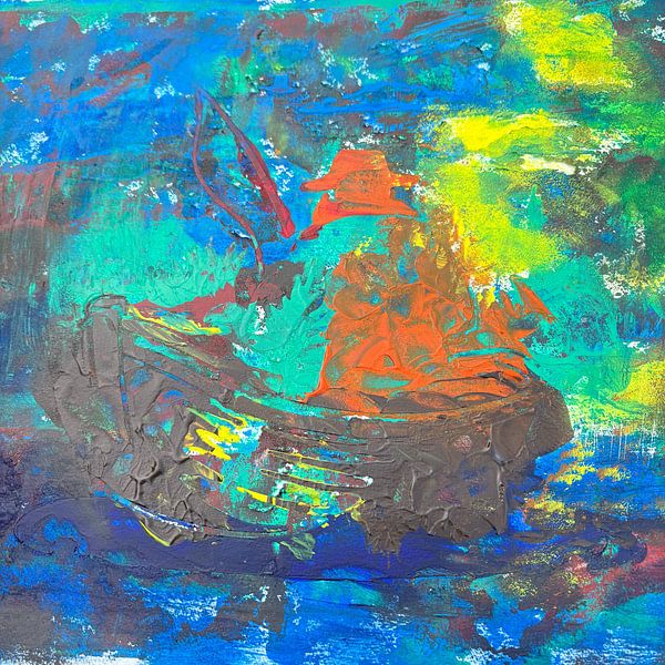Ein Lebendiges Fischerboot, auf dem ein Fischer konzentriert seiner Arbeit nachgeht. Die Kräftigen Farben, leuchtendes Orange für die Figur, satte Blautöne für das Wasser und intensive Grün und Gelbtöne im Hintergrund, vermitteln Bewegung und Atmosphäre. Die Dick aufgetragenen Farbschichten und der strukturierte Pinselduktus erzeugen…