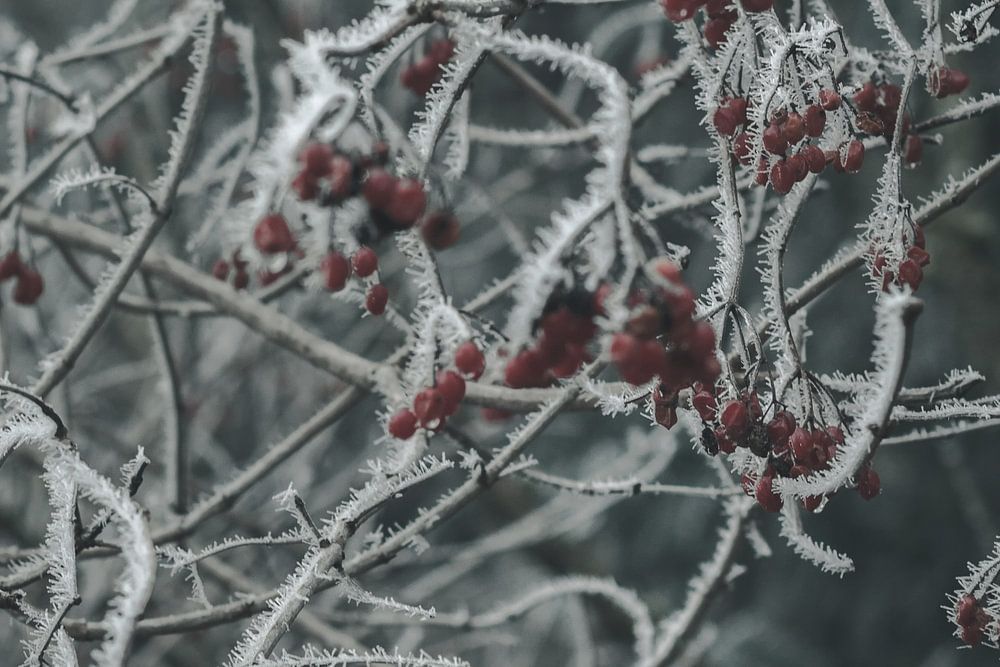 Morgenfrost bei auf den roten Beeren der Weißdorn Gewächses im Winter
