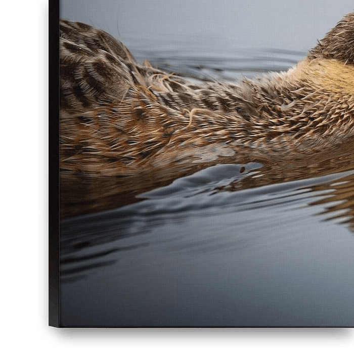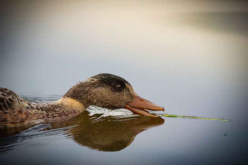 Bestelle das Foto Morgenmahlzeit: Ente mit Grashalm von M.J. Lagerwerf als Reproduktion auf Leinwand, Alu-Dibond, als Poster, Fototapete oder Acrylglasbild.