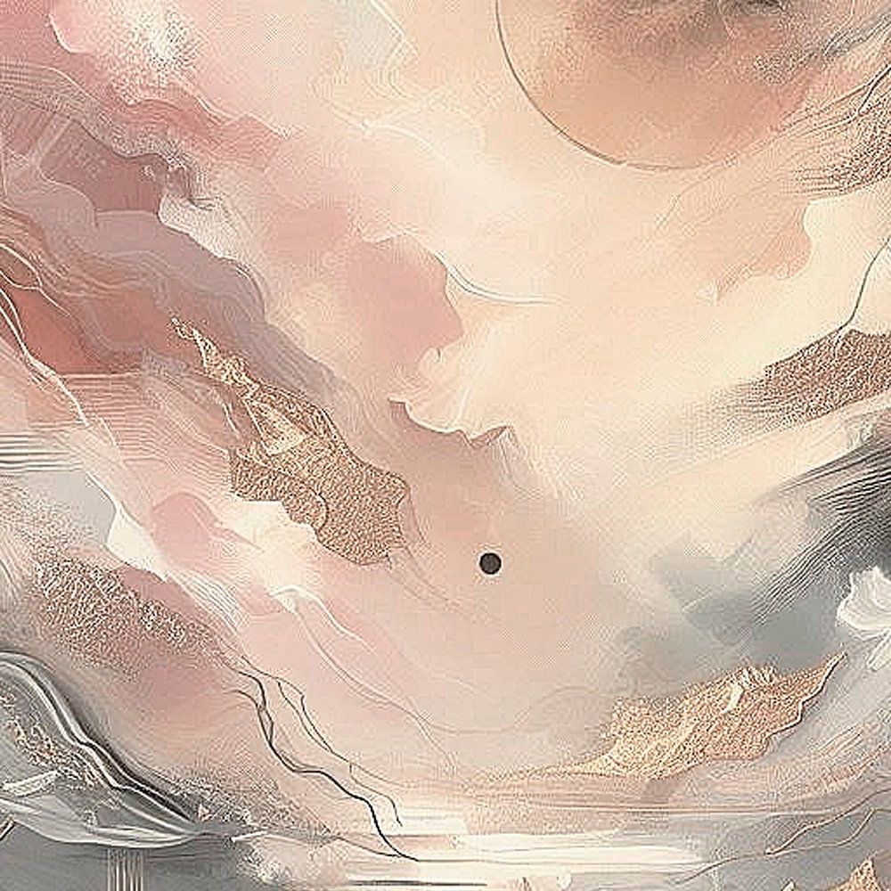 Ein nebliger, weicher, rosafarbener, grauer Morgen, erstellt mit Artificial Intelligence A. i. art und digital bearbeitet mit Photoshop. Die Sonne versucht, durch die Wolken zu scheinen, so dass eine weiche rosa goldenen Glanz.