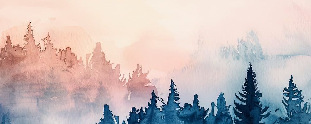 Dieses heitere Aquarell zeigt eine Waldlandschaft, die in einen weichen, pastellrosa Morgennebel gehüllt ist.