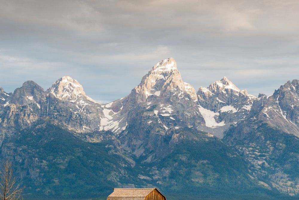 Mormon Row Scheune mit den Tetons im Hintergrund, Grand Teton Nationalpark, Wyoming, USA