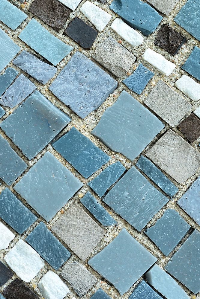 Oberfläche der Fassade eines Hauses mit kleinen Mosaiksteinen, die Teil eines großen Wandbildes des Künstlers Bert Heller sind. Bei dem Gebäude handelt es sich um das 1964 in der DDR eröffnete Cafe Moskau in Berlin.