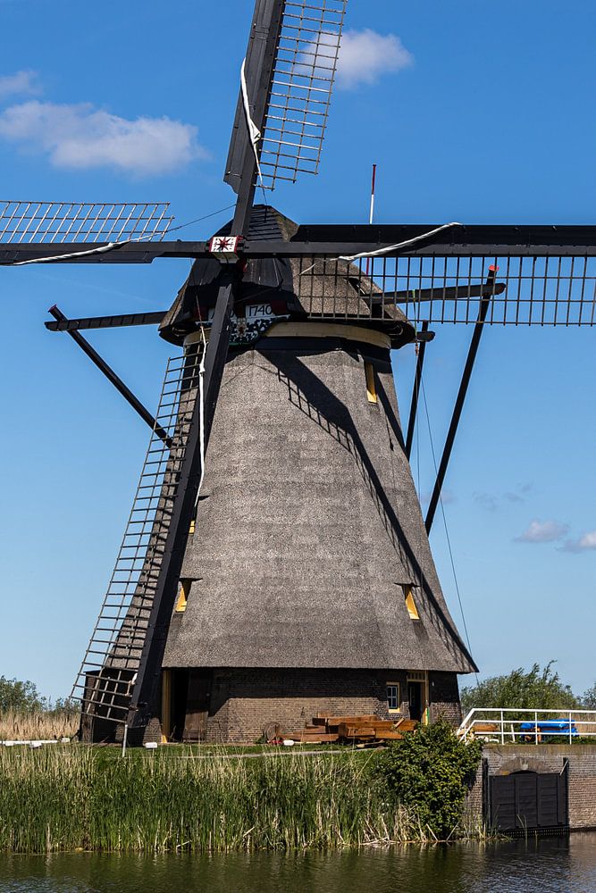 Foto von einer der Mühlen in Kinderdijk. Hergestellt in der Frühlingssonne.