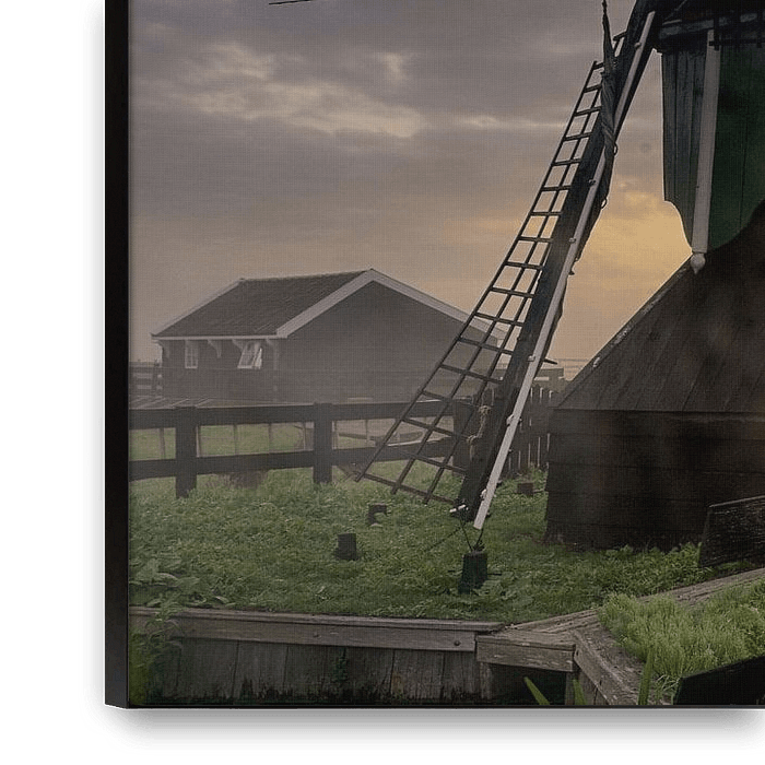 Mühle Zaanse Schans bei Sonnenaufgang mit Bodennebel