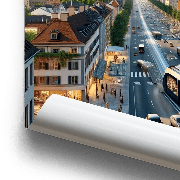 Das moderne Poster zeigt eine futuristische Vision der Stadt München. Diese beeindruckende digitale Darstellung kombiniert traditionelle Architektur mit modernen, schwebenden Gebäuden und urbaner Begrünung, die die Zukunft der Stadt visualisiert. Im Vordergrund erkennt man die Frauenkirche, eines der bekanntesten Wahrzeichen Münchens,…