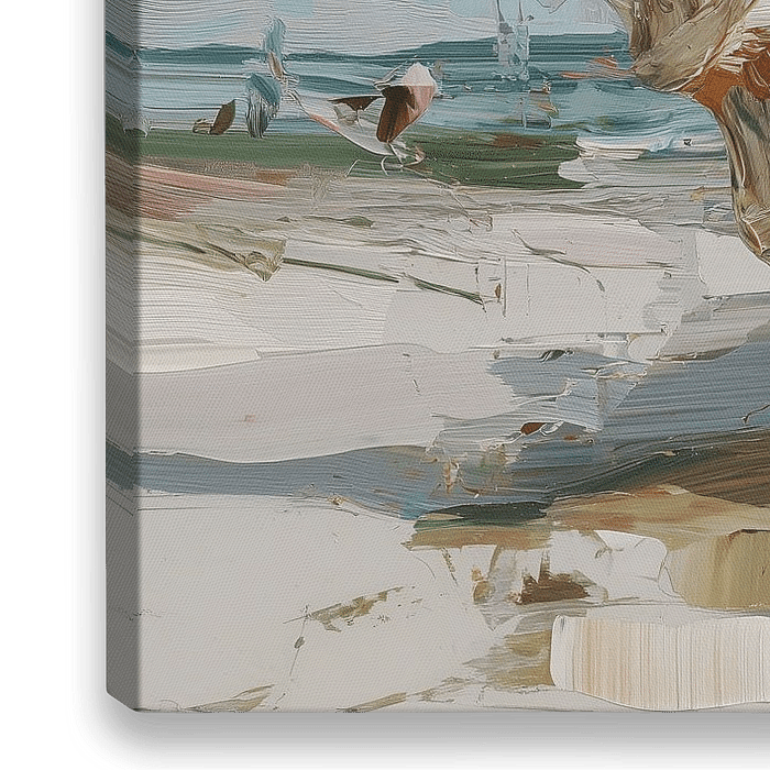 Dieses moderne Kunstwerk zeigt eine große Muschel, die ruhig am hellen Sandstrand liegt. Die impressionistische Malweise mit kräftigen Pinselstrukturen und sanften Pastelltönen verleiht dem Motiv eine luftige, sommerliche Leichtigkeit. Die Kombination aus Meer, Licht und natürlicher Form schafft eine entspannte Küstenatmosphäre und…