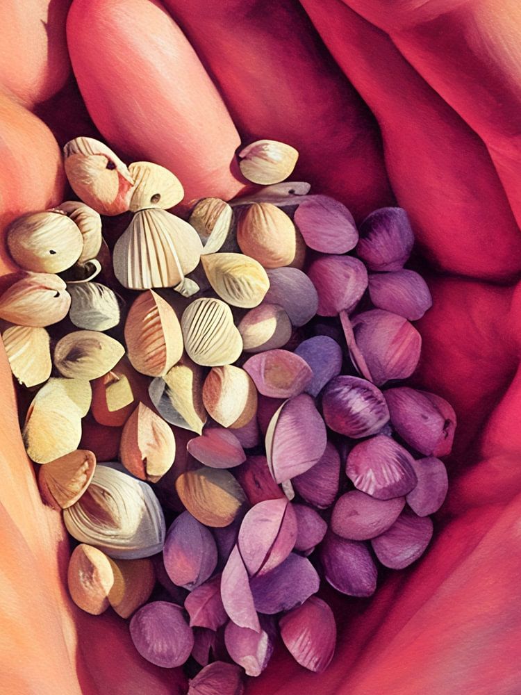 Eine Nahaufnahme zeigt eine dichte Ansammlung von Muscheln, die über eine sandige Fläche verstreut sind. Die Muscheln sind überwiegend weiß und beige, einige weisen subtile Schattierungen von Grau und Braun auf. Ihre komplizierten Muster und Texturen sind sichtbar und unterstreichen die natürliche Schönheit dieser Meeresschätze.