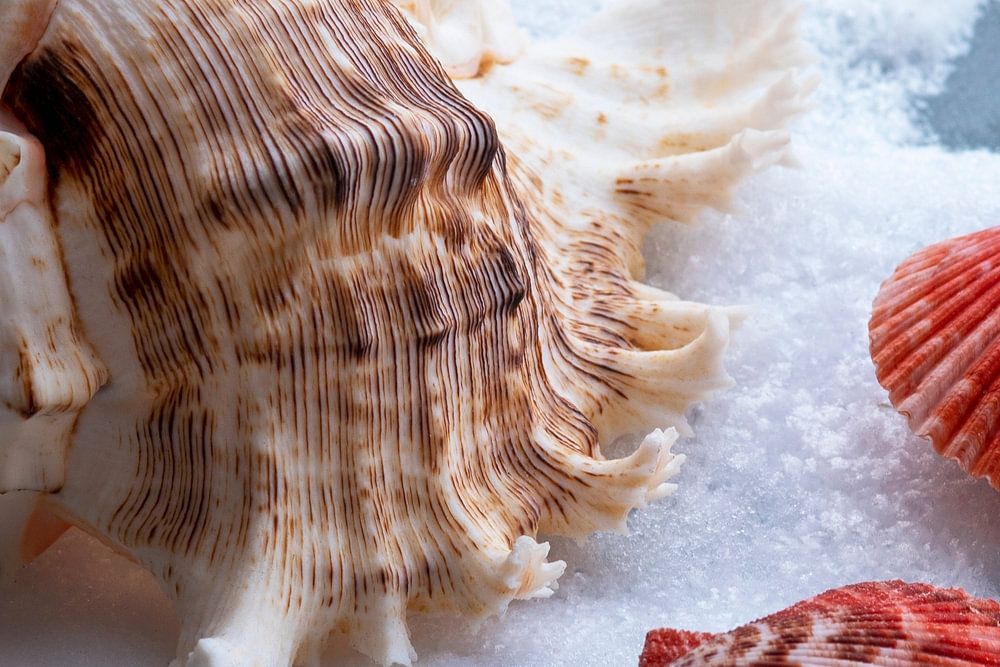 Ich war in kreativer Stimmung und habe draußen ein paar Muscheln auf das Eis gelegt. Der Kontrast der roten und braunen Muscheln gegen den weißen Schnee auf dem Eis macht es zu einem farbenfrohen Bild.