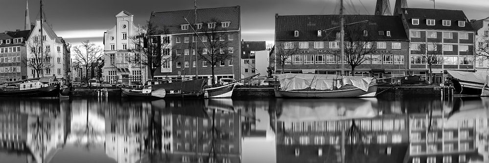 * Lübeck Museumshafen * Black & White Stadtbild. Panorama der Hansestadt Lübeck mit Altstadt , Museumshafen und Malerviertel an der Trave / Untertrave im Abendlicht.