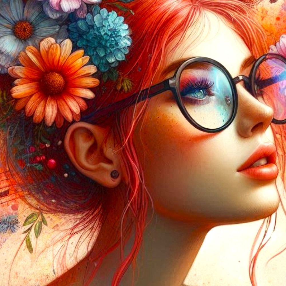 Dieses Porträt eines singenden Mädchens inmitten bunter Blumen hat rote Haare und eine große Brille. Singen macht glücklich und fröhlich, und das gilt auch für den Anblick dieses Werks. Was für ein erstaunliches Porträt.