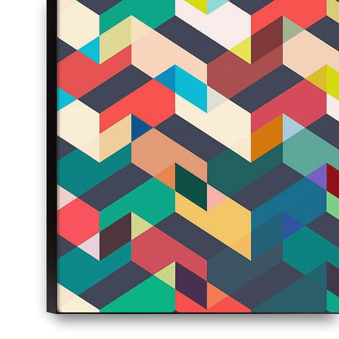 Ein grafisches Kunstwerk mit einem farbenfrohen Muster mit isometrischen Formen in verschiedenen Schattierungen. Das geometrische Design verleiht der Komposition Tiefe, während die Schlichtheit durch klare Linien erhalten bleibt.