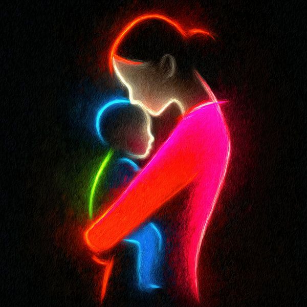 Bestelle diese Malerei Mutter und Baby Neon-Silhouette von TheXclusive Art als Reproduktion auf Leinwand, Alu-Dibond, als Poster, Fototapete oder Acrylglasbild.