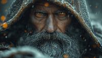 In diesem eindringlichen Porträt blickt ein Mann mit intensiven, bernsteinfarbenen Augen direkt in die Seele des Betrachters. Sein Gesicht ist von einem wettergegerbten, grauen Bart eingerahmt, und sein Kopf ist von einem Umhang bedeckt, der von winzigen Schneeflocken besprenkelt ist. Die Tiefe und Klarheit seines Blickes vermitteln das…