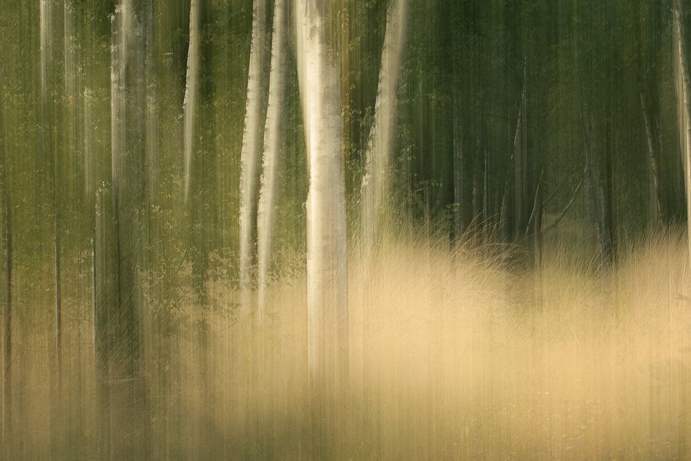 Waldlandschaft im August. Die lange Verschlusszeit und die Bewegung verleihen ihm etwas Geheimnisvolles.