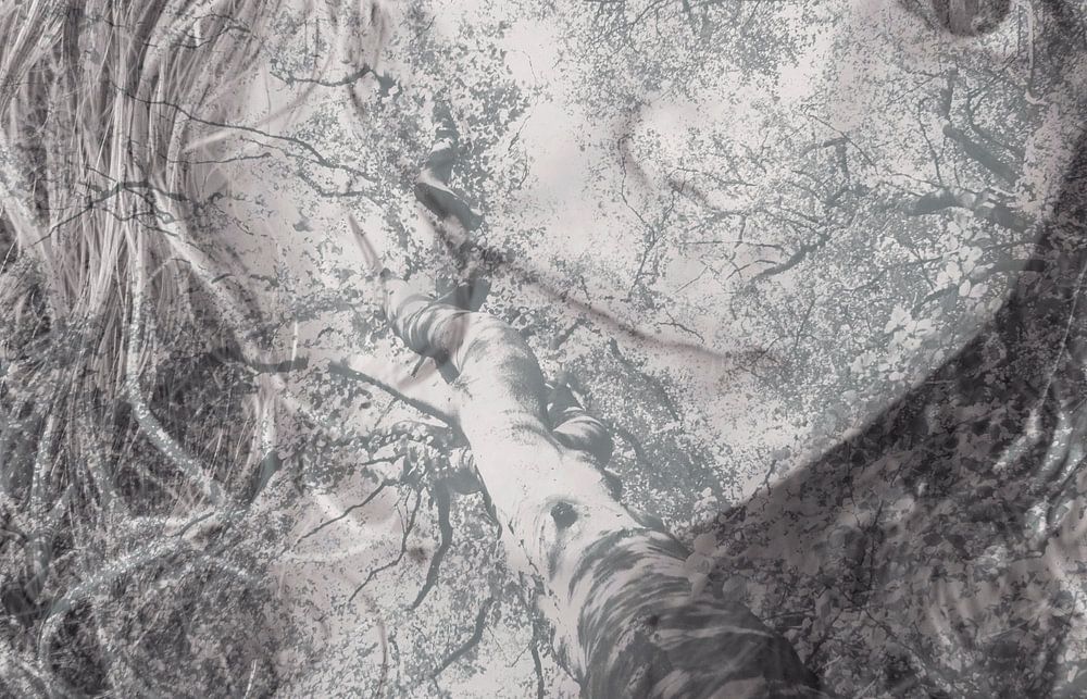 Das Gesicht eines Mädchens in den Baumkronen. Eine Verschmelzung von zwei Fotos (Mehrfachbelichtung).