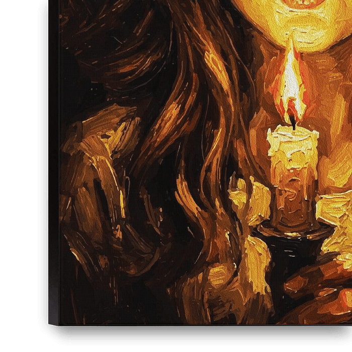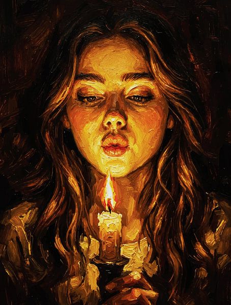 Dieses eindrucksvolle Ölgemälde zeigt eine junge Frau mit langem kastanienbraunem Haar, die beim Ausblasen einer Kerze festgehalten wird, wobei der Schein der Flamme bezaubernde Schatten auf ihr Gesicht wirft. Dieses Gemälde ist ideal für Wandkunstliebhaber und verleiht jedem Raum eine geheimnisvolle und romantische Note, indem es…