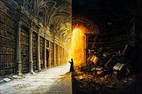 Ein faszinierendes Kunstwerk, das den Zauber von Wissen und Zeit einfängt. Das Design zeigt eine wunderschöne Bibliothek mit einem auffälligen Kontrast zwischen Licht und Dunkelheit. Die linke Seite strahlt Klarheit und Ordnung aus, während die rechte Seite eine geheimnisvolle, baufällige Atmosphäre hervorruft. Die zentrale Figur, die…