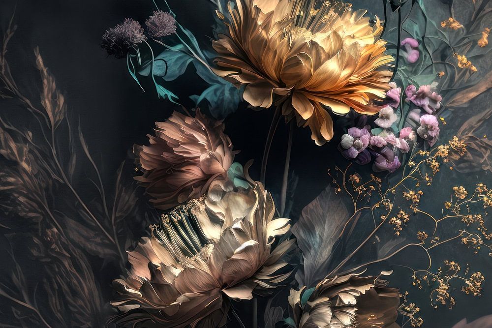 Die gesamte Szene strahlt eine ruhige und introspektive Atmosphäre aus, die den Betrachter einlädt, tiefer über die Symbolik der Blumen und die Bedeutung des dunklen Hintergrunds nachzudenken. Das Gemälde scheint auf eine geheimnisvolle Geschichte anzuspielen, die darauf wartet, entdeckt zu werden.