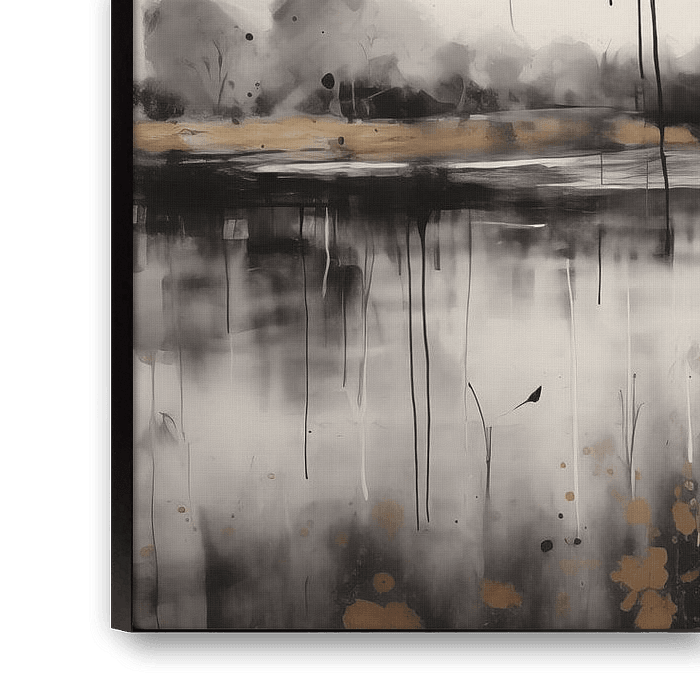 Der tiefe, durchdringende Blick der Kuh in diesem Kunstwerk spiegelt einen Moment der Introspektion und Nachdenklichkeit wider. Die goldenen Flecken vermitteln einen Schimmer von Wärme und Hoffnung inmitten der überwiegend monochromen Farbgebung. Das Kunstwerk suggeriert sowohl die Stärke als auch die Zerbrechlichkeit der Natur. Die subtilen Reflexionen im Wasser und der stimmungsvolle, verträumte Hintergrund verleihen der Szene eine ätherische Qualität.