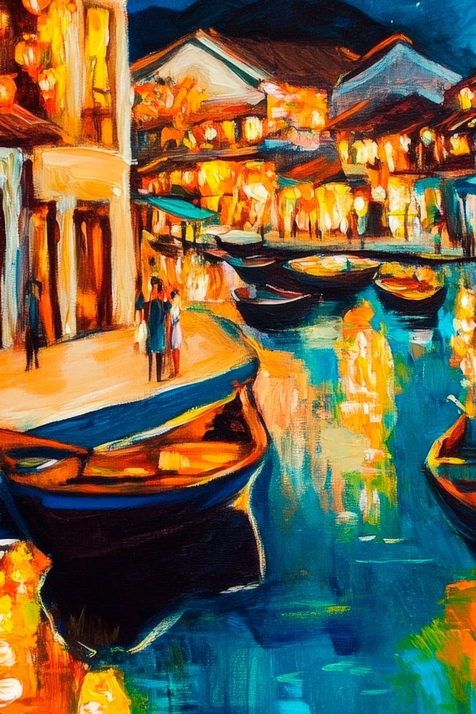 Eine magische Harmonie aus schimmerndem Wasser und leuchtenden Laternen entfaltet sich unter dem sternenklaren Himmel. Die bunten Reflexionen auf der Wasseroberfläche erinnern an verträumte Nächte in einer lebhaften Stadt. Ideal für das Wohnzimmer, schafft dieses Kunstwerk eine einladende und inspirierende Atmosphäre, die zum Verweilen und Träumen anregt.