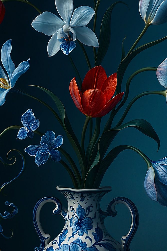 Ein stilvolles Stilleben mit blauen und roten Blumen in einer klassischen delfterblauen Vase vor einem tiefen, dunklen Hintergrund. Elegant, ruhig und zeitlos.