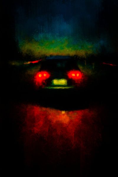 Dieses impressionistische Gemälde fängt eine Nachtlandschaft ein, in der das Abendlicht langsam hinter dem Horizont versinkt. Die roten Rücklichter des Autos bilden einen warmen Brennpunkt in der Dunkelheit und schaffen einen stimmungsvollen Moment der Straßenstimmung.